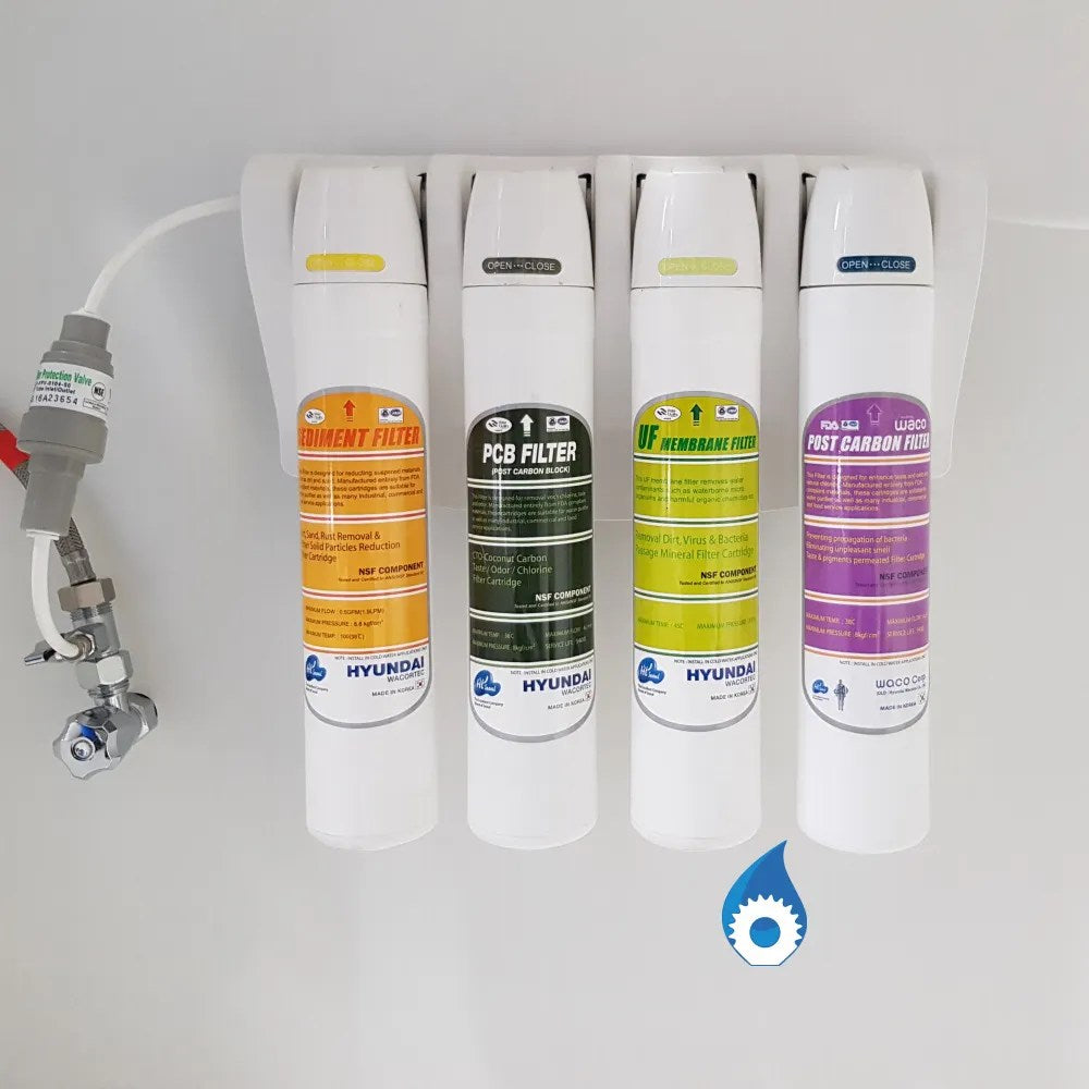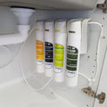 Our under sink filters vary by how many stages of filtration they use, each designed to meet different household needs. Twin-stage systems come in two versions: the Waco Twin uses a sediment filter followed by a carbon block to remove dirt, rust, chlorine, and chemical contaminants, making it ideal for improving basic water quality and taste. The Twin Ultrafiltration model replaces the sediment filter with a 0.03-micron ultrafiltration membrane, which also removes bacteria and viruses, offering a more advanced level of protection for homes with inconsistent water quality. Triple-stage systems offer more filtration; one version combines sediment, carbon, and ultrafiltration for reliable removal of particles, chlorine, and pathogens, while the alkaline model starts with ultrafiltration, then adds a mineral-rich alkaline filter to boost pH and improve taste, followed by a carbon stage for final polishing. Our four-stage systems offer the most complete filtration in our standard (Not Reverse Osmosis) line up. The standard version runs your water through sediment and carbon filters, an ultrafiltration membrane, and finishes with a second carbon stage to polish the taste. The alkaline model swaps that final carbon stage for an alkaline cartridge that boosts pH and adds healthy minerals like calcium and magnesium, then finishes with carbon to clean up any remaining taste or chemicals. The more stages your system has, the more protection you get from basic chlorine removal in our twin systems, to bacteria and virus filtration in triple models, all the way to smoother, mineral-rich water in our four-stage alkaline setups.